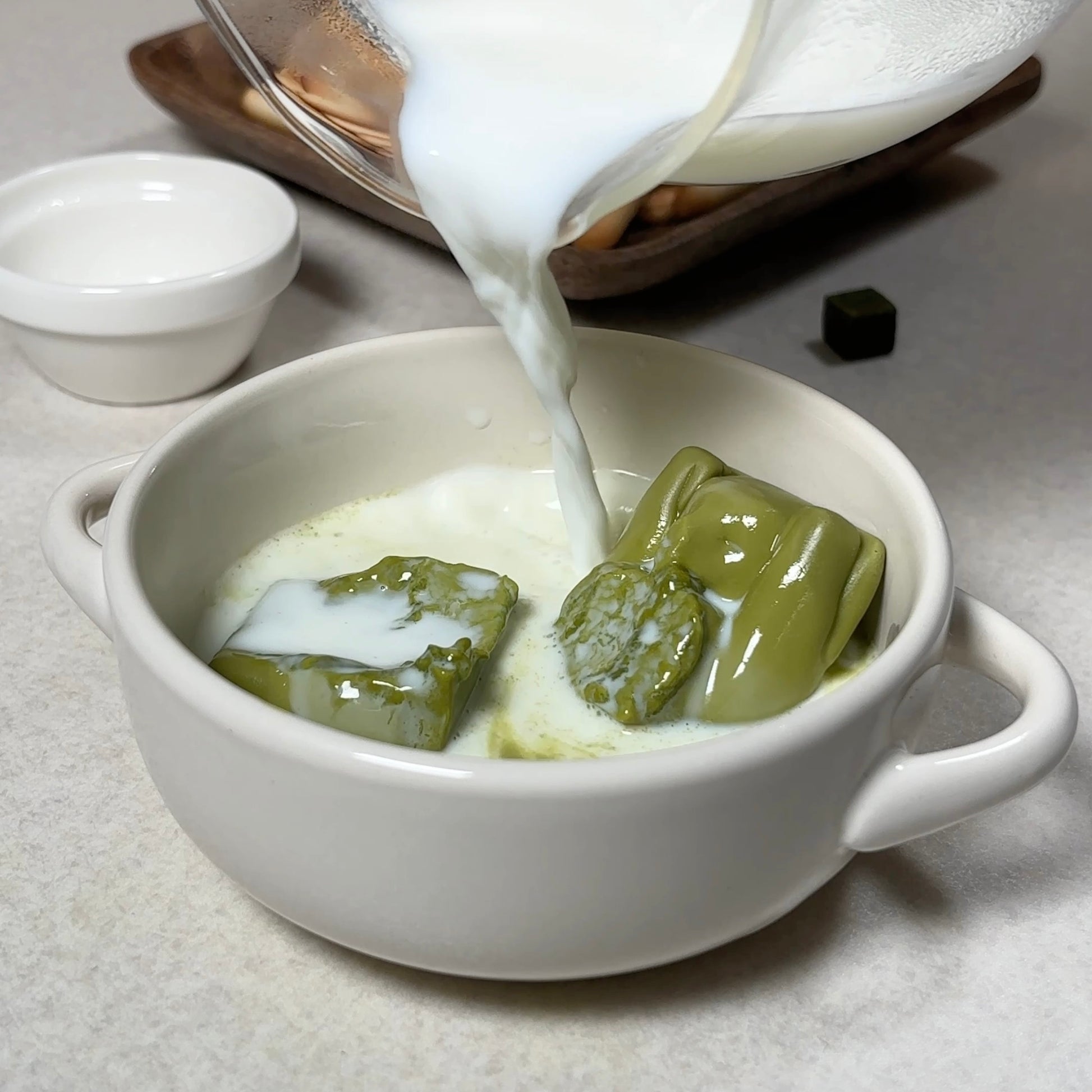 食べる際はまず、お腹で守っている茶箱を取り出します。これは卵のようなもので本体よりも味が濃厚です。先に食べてもいいですし、締めに楽しんでも良いでしょう。マイルドで深みのある本体はそのままでももちろん美味しくいただけます。厚みがあるので、ホットミルクをお腹の穴に注いで溶かしながら崩して食べる方法もおすすめです。