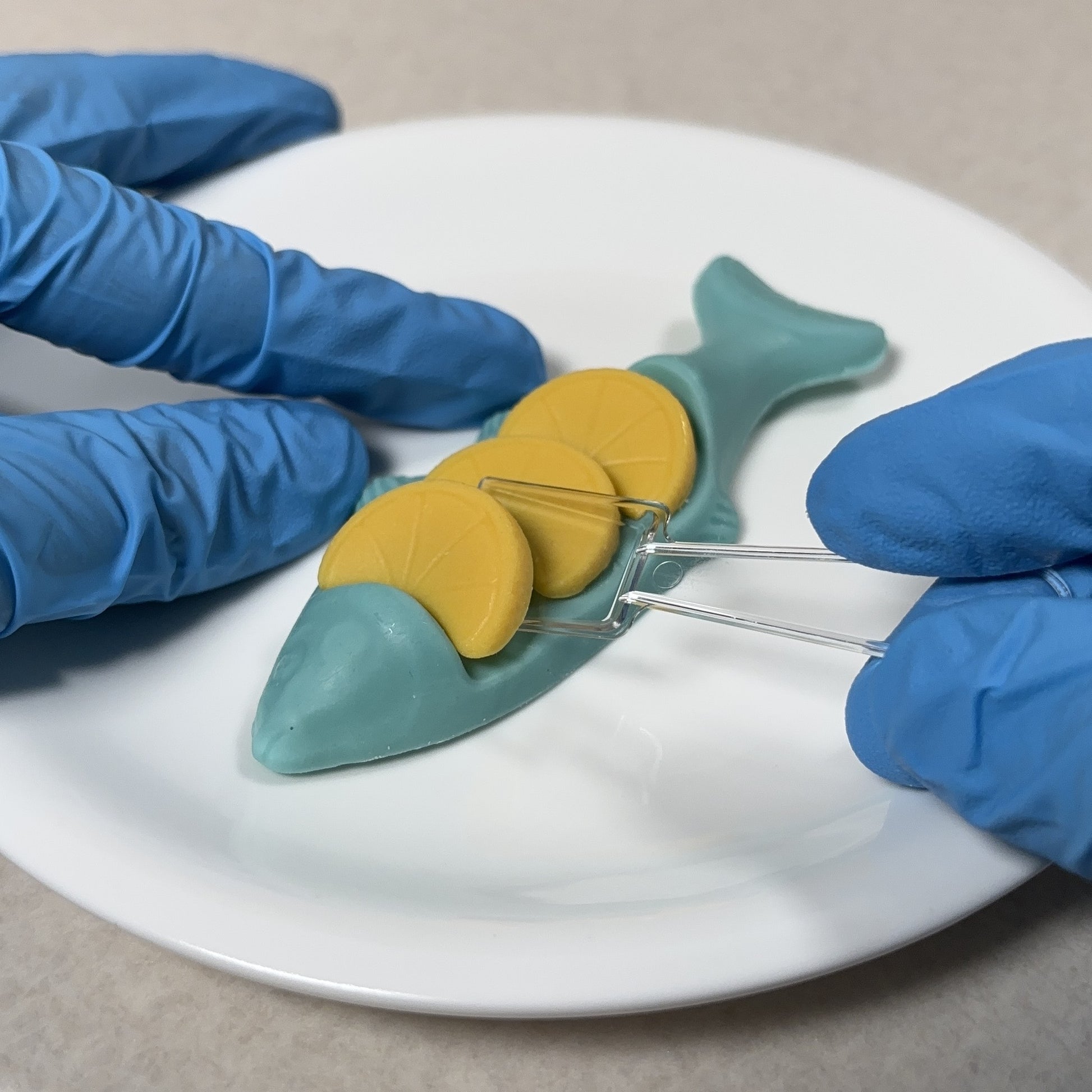レモンとチョコレートが食べたすぎて水槽から飛び出し、陸に進出したレモンアジ。成熟すると目、ヒレ、背中にレモンのような模様が浮かびます。そんなレモンアジを捕獲し、半身をおつくりにしてココアバターを塗り熟成させました。